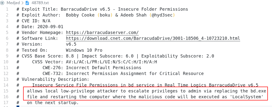 ## Insecure File/Service Permission C:\>cacls C:\bd\bd.exe C:\bd\bd.exe BUILTIN\Administrators:(ID)F NT AUTHORITY\SYSTEM:(ID)F BUILTIN\Users:(ID)R NT AUTHORITY\Authenticated Users:(ID)C