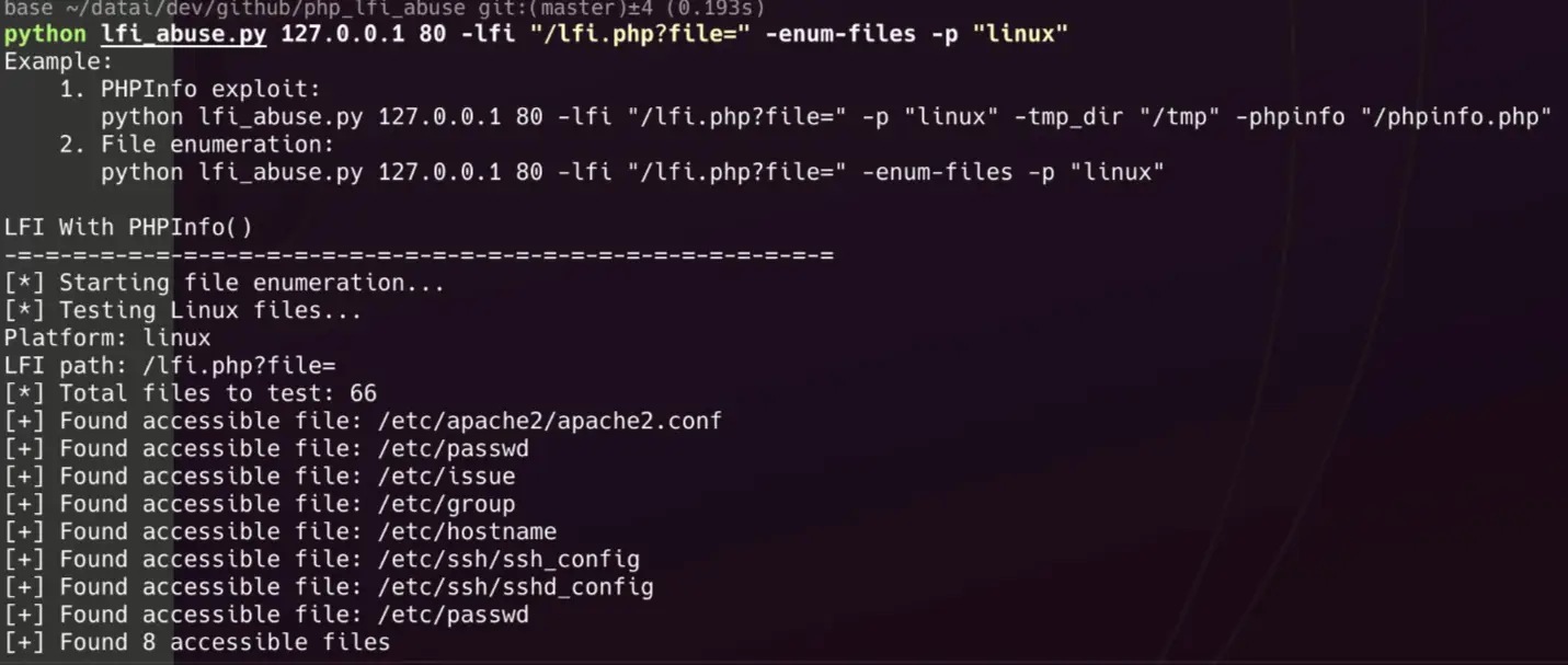 1 | python lfi_abuse.py 127.0.0.1 80 -lfi "/lfi.php?file=" -enum-files -p "linux" |