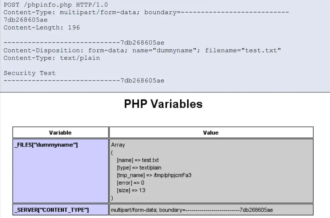 当我们通过POST请求向任意PHP文件上传文件时,PHP都会accept, 并把它存储在一个临时文件夹下,直到当前request完全结束时,会把这个临时文件删除,如果我们可以在请求结束之前获取到文件路径和临时文件名(linux下通常是 /tmp/php[6*random digits],Windows下一般是 C:\Windows\Temp, 具体路径可以在upload_tmp_dir中指定),那么就可以通过LFI来利用它。