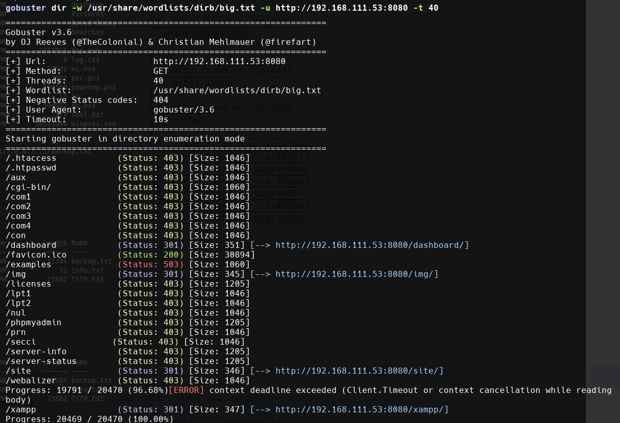 gobuster dir -w /usr/share/wordlists/dirb/big.txt -u http://192.168.111.53:8080 -t 40