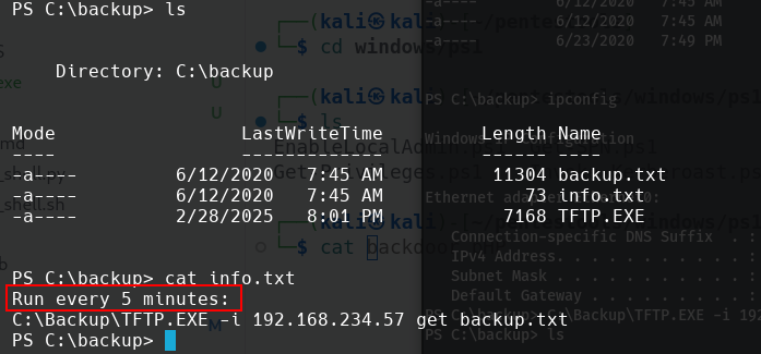 - 在看了hits后提示find backup, 在C:下找到backup, 查看info.txt, 但是眼瞎没看到run every 5 minute,实际上我确定是我自己选择性忽略了,因为在第一次cat之后,我甚至没注意看执行的是什么命令。 为什么?把前面当做命令提示符了? 想着先分析一下backup.txt? 看到run…认为是系统输出的信息了?